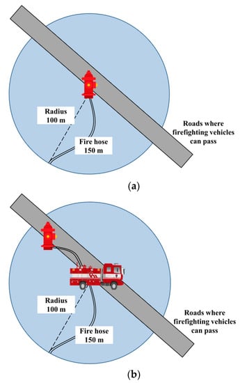 In South Korea (according to Article 6 of the Fire Services Act), fire hydrants should be installed within a distance of 100 m from firefighting targets in industrial, commercial, and residential areas. In addition, the effective operation range of the fire brigade should be within a combined length of 10 extended fire hoses (150 m), considering the speed and accuracy of firefighting activities. The extension of firefighting hoses along a road is within a radius of approximately 100 m if geometrically calculated considering the curves of the fire hose [].