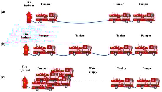 Finally, water supply strategies were considered with respect to the distance between the fire hydrant and the site of the fire. Figure 2 presents the firefighting vehicle squad organisation and response strategies in South Korea. If the distance between a fire hydrant and the scene of the fire is less than 200 m, a pumper is connected to the fire hydrant to supply water to the tanker used for firefighting activities (Figure 2a). If the distance ranges from 200 to 400 m, a relay vehicle is positioned at the middle point and water is supplied to the tanker by a direct connection between the fire hydrant and the tanker (Figure 2b). For distances of 400 m and more, several vehicles receive water from nearby fire hydrants and supply it to the tanker (Figure 2c). In this study, firefighting targets and regions outside of 200 or 400 m from the fire hydrants were set as vulnerable areas with respect to firefighting activities, considering the direct connection between fire hydrants and the fire brigade. This was done to facilitate an uninterrupted water supply and the prevention of traffic congestion.