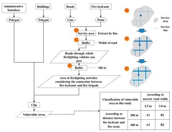 In general, accessibility includes both regional proximity and regional availability []. Regional availability can be considered as the ratio of supply–demand for each demand location within a given threshold, and regional proximity accounts for the spatial interactions between the supply and demand sides []. Raškauskaitė and Grigonis [] analysed the regional proximity and regional availability of fire hydrants using the GIS buffer tool. However, the operation of firefighting vehicles was excluded because road environments were not considered, similar to the study conducted by Wielebski and Medyńska-Gulij []. In previous studies, the range within which fire hydrants can be used was analysed based on the fire hydrant location. At the actual firefighting sites, the fire brigade is equipped with firefighting pumpers and tankers, and fire hydrants are secondary facilities for the supply of firefighting water. Therefore, the fire brigade location should be considered for the analysis of the operational range of actual firefighting activities. Moreover, narrow alleys through which fire engines cannot pass result in delayed firefighting operations and rescue, thereby causing considerable human casualties and property damage [,]. Therefore, in this study, an analysis method for the operational range of firefighting activities in vulnerable areas was proposed with respect to the fire hydrant location, fire brigade operation, and road width. The proposed method was applied to an urban area in South Korea, and a discussion is presented on its applicability and scope of future development.