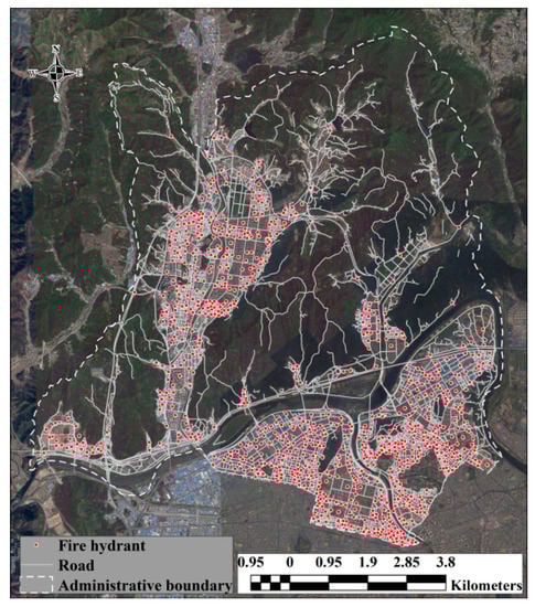 The area of Buk-gu, Daegu City is 94.16 km2. There are 42,160 buildings and a population of 437,710 people in the area. There are 904 fire hydrants in this area. In total, 3865 fires occurred in the area over a period of 10 years (2007–2016). Figure 4 presents the distribution of roads and fire hydrants within the target area.