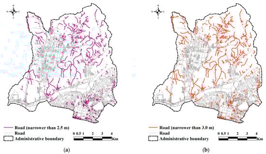 In this study, the GIS service area tool was used to analyse the regional proximity of firefighting activities. As detailed in Section 2, in the network analysis, 2.5 and 3.0 m were set as the thresholds of road widths for the passage of large/midsize and small/compact firefighting vehicles, respectively. Figure 5 presents the distribution of roads within the target area through which firefighting vehicles cannot pass.