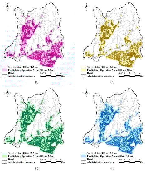 Analysis results of the area of firefighting operation considering the connection between the fire hydrants and fire brigade (a) within 200 m from fire hydrants, small vehicles are allowed to pass, and large vehicles are not allowed to pass; (b) within 200 m from fire hydrants, both small and large vehicles are allowed; (c) within 400 m from fire hydrants, small vehicles are allowed to pass, and large vehicles are not allowed to pass; (d) within 400 m from fire hydrants, both small and large vehicles are allowed to pass.