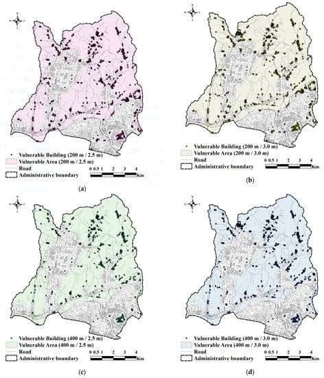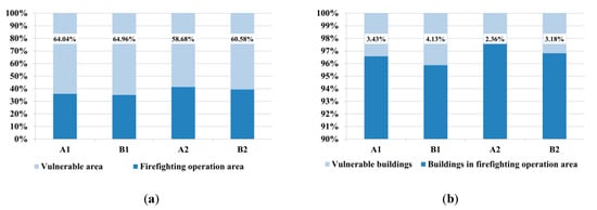 Analysis results of vulnerable areas for firefighting activities. (a) Area; (b) total number of buildings.