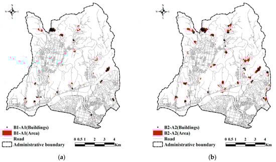 Analysis results of vulnerable areas for firefighting activities with respect to the types and combinations of vehicles to be dispatched. (a) Vulnerable area B1—vulnerable area A1, 279 locations; (b) vulnerable area b2—vulnerable area A2, 384 locations.