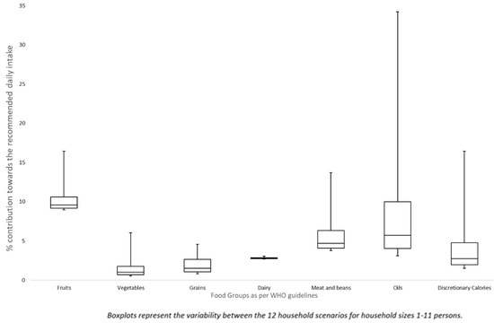For our analysis, we calculated annual food provision entitlement for each of the 12 household scenarios. This was then translated to food provision entitlement per annum per applicant. For this conversion, it was assumed that households include only adults without any special dietary needs. No provision was made for children, pregnant/lactating women, and so forth, due to a lack of the relevant data and the computational nature of the analysis. The annual food provision per applicant was then translated to daily food provision in g/day. Food provisions were then analyzed as portions of foods in each of the five WHO-recommended food groups (e.g., a daily provision of milk and a daily provision of cheese were combined for the daily provision of dairy) and the relative contribution of FEAD toward achieving the recommended intake of each food group was calculated [25]. For each food group, the FEAD contribution toward the recommended food group portion intake was calculated for each of the 12 potential household sizes separately and presented using box plots, showing the range and the differences among each scenario.