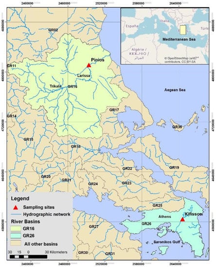 Two rivers outflowing in the Aegean Sea were studied (Figure 1). The Kifissos Attica River, a small urban river, drains in the catchment of the western part of Athens metropolitan area (~3.8 million inhabitants). The river is ~25 km long, flows along the west part of the city and ends up in the Saronikos Gulf close to the port of Piraeus. For most of the year, water flow is low (3.2 m3 s−1) [], but the river is subject to flooding events depending mainly on annual precipitation, during which water fluxes may reach from 700 to 1400 m3 s−1 []. Approximately 70% of its catchment is currently a built-up urban area characterized by mixed land uses, such as operating and abandoned factories, small and medium-sized enterprises, warehouses, and illegal areas for the fly tipping of solid waste. The main highway runs along the river basin, and the last 10 km of the river corridor are channeled under the highway. All these activities led to the chemical pollution of the river water and sediments [,]. The Pinios Thessaly River basin is located in central Greece, one of the most intensely cultivated agricultural areas, and flows out into the Aegean Sea (Figure 1). The Pinios hydrological basin is approximately 9800 km2 with an average discharge of 103 m3 s−1 []. Apart from intensive agricultural activities that led to the extensive use of agrochemicals, groundwater overexploitation, deforestation, and heavy soil erosion, the Pinios River also faces significant threats from semi-industrial activities (e.g., olive mills and slaughterhouses) and hydromorphological alterations (e.g., dams and channelization) []. In addition, treated waste from the cities of Larissa (~150,000 inhabitants) and Trikala (~60,000 inhabitants) flows out into the river. Both are considered to be typical small-to-medium-sized Mediterranean river types (with seasonal high and low hydrological regimes) that discharge into the Aegean Sea, and area important freshwater contributors of organic matter from central and southern Greece to eastern Mediterranean waters. On the basis of all the above, our study contributes to the identification of MP river pathways and their relative importance, since they cover different features, and display several and diverse stressors from various sources, further affecting the eastern Mediterranean basin.