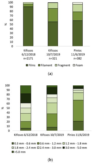 Figure 3a shows the percentage contribution of various shape types of MPs recorded in the samples. In the sample collected in Kifissos River in winter 2018 during high-flow conditions, films corresponded to 90% of the total number of MPs, and filaments and fragments to 6% and 4%, respectively. The samples collected from both rivers during summer low-flow conditions had very similar composition. Once again, films appeared to be the dominant category, corresponding to 56–59%, followed by filaments with 20–30% and fragments at 3–17%. Foam particles were present in very low abundance, corresponding to 0.08–4% of the total number of particles. Pellets were not detected in our samples.