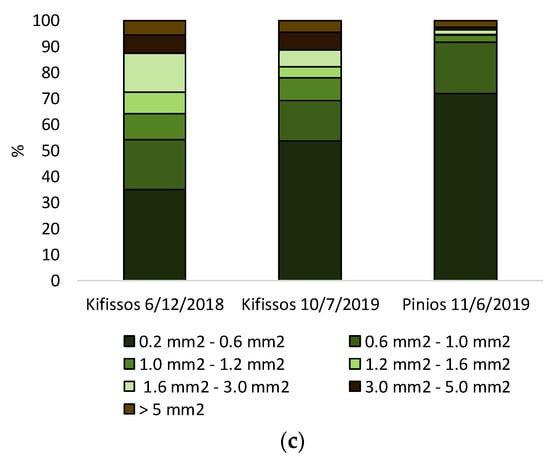 We further determined the individual sizes of all MPs using image analysis presented in Figure 3b,c. Both samples collected in the urban Kifissos River were dominated by MPs with relatively large sizes (average length: 3.07 ± 2.34 mm on 6 December 2018; 2.21 ± 2.72 mm on 10 July 2019). About ~60% of the particles had <3.0 mm sizes during high-flow conditions, and 80% during low flow. On the other hand, in the two replicate samples of Pinios River, up to 93% of the particles corresponded to size bins < 3.0 mm (84% < 1.4 mm) (average length: 1.59 ± 3.31 mm). Similarly, the percentage of particles (excluding filaments) with area ≤ 1 mm2 in Kifissos River was only 54% in winter, rising to 69% in summer; for the two replicate samples collected in Pinios River, this percentage reached 91% (Figure 3c). The size analysis of the MPs described above shows that, in the urban Kifissos River, there is proliferation of relatively larger particles, including mesoplastics (>5 mm), in contrast to Pinios River, were small particles were present.