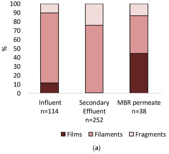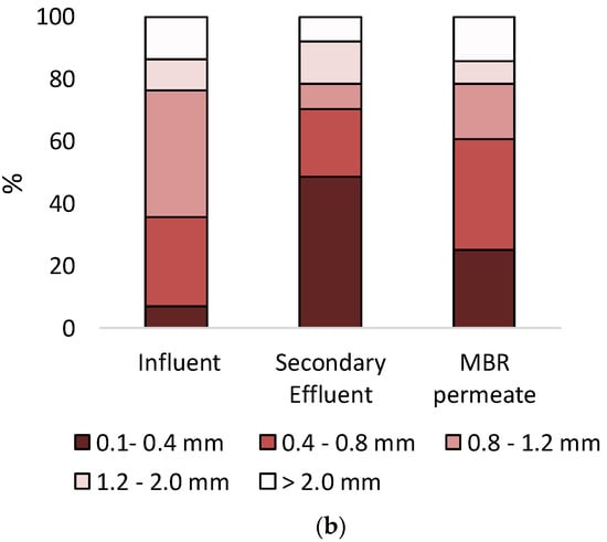 Since both plants operate within the greater Athens metropolitan area, and samples gave similar results in MP concentrations in the influents, we show combined data on MP properties in the influents for the two plants. Regarding the various types of MPs identified in the influents, filaments were dominant (~75%), followed by films and fragments (Figure 5 and Figure 6a). Compositional differences between influent and effluent samples imply that the secondary treatment did not show any selective retention capability, with filaments holding ~80% share, while the MBR treatment appeared to be more effective on filaments. In the MBR permeate, filaments and films held a more or less equal share (~40%). As shown in Figure 6b, about 78% of MPs had lengths ≤ 1.2 mm in both influents and effluents, and low percentages of larger MPs were present in all types of sewage. For the smaller particles, however, results showed that the effectiveness of the secondary treatment progressively increased from the 0.1–0.4 mm to the 0.8–1.2 mm size range, while MBR seemed to be more or less equally effective for all size ranges. The detection of MPs in the MBR permeate with sizes larger than the membrane pore size is quite surprising and may be related to elongated particles (e.g., filaments) that may pass the membrane pore by their shortest dimension, which is in the order of the membrane pore opening. However, no sound conclusions can be drawn due to the limited number of analyzed samples in the present study.
