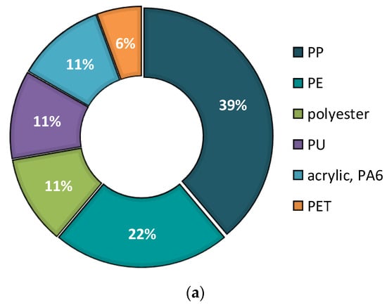 In total, 444 particles were counted in the WWTP samples, and 44 particles including filaments were randomly selected and subjected to FTIR analysis using the microspectroscopy accessory. Six polymer types were identified. Figure 7a shows the relative contribution of these materials in the total number of MPs analyzed in influent and effluent samples. Found polymers were polyester and PET, acrylic, and polyamide PA-6 (nylon-6) (Figure 7b). These polymers, and PP and PE are used for textile manufacturing (synthetic clothes, sports clothing, carpets, etc.), and it is not surprising that they were present in household wastewaters. PE, PP, and PET can be found as fibers and in other forms, and they are the most commonly used polymers for plastic packaging. The only polymer not used in textiles and/or packaging is PU, which is related to various household products (e.g., kitchen or bathroom sponges). This description of polymer uses is reflected in their percentage contribution in our samples, where PP, PE, and PET held 80%.