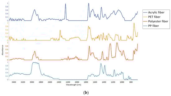 (a) Polymeric composition in subset of MPs (n = 44) analyzed in WWTP samples. (b) Representative FT–IR spectra of filaments or fibers found in WWPT samples.