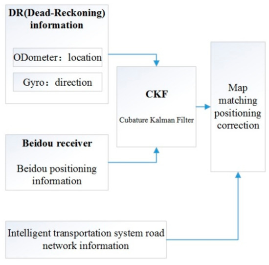 Based on the existing positioning technology, this chapter proposes a vehicle–road coordinated combined positioning method based on Beidou. The odometer is used as the observation sensor of the system, the position and attitude of the vehicle is calculated through cumulative measurement, and the observation information is given with the GNSS system integrated navigation. This method combines the advantages of satellite positioning and track estimation and uses the volume Kalman filter algorithm for positioning data fusion. Compared with UKF, CKF reduces the calculation and complexity of the algorithm; compared with EKF, CKF improves the filtering accuracy [19]. Random errors in Beidou positioning are compensated for and the vehicle positioning trajectory is smoothed, thereby improving positioning accuracy and reliability of positioning results, and better adapting to nonlinear systems. At the same time, considering that the vehicles in the urban traffic system can only travel on the road, and the road network information transaction is easy to obtain, the vehicle trajectory after the combined positioning of Beidou and track is further used to correct the positioning accuracy by map matching. The research ideas are shown in Figure 2.