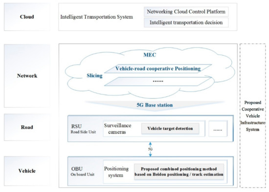 Firstly, high-precision positioning is the basis of intelligent vehicle–road coordination. Ding proposed an auxiliary positioning method that uses machine vision to recognize road markings through a vehicle-mounted camera [3]. This method establishes a dynamic geometric vector model of vehicles and road marking points. Through the use of smart terminals, the vector changes of road landscape markings and vehicles are obtained to improve the accuracy of satellite positioning. Location accuracy is a key factor to meet the requirements of several safety applications for vehicle networking, which will become the future application scenario of the fifth-generation (5G) mobile communication system. In Liu’s research, a cooperative positioning system is proposed [4]. The system realizes the fusion of received signal strength (RSS), carrier frequency offset (CFO) and global positioning system (GPS) observation data, thereby enhancing the tolerance for GPS visibility limited conditions. In addition, an algorithm based on neural network is introduced to optimize the accuracy of the cooperative positioning system. Gerges [5] proposed a method to distinguish highway lanes without requiring expensive global navigation receivers in each vehicle. Accurate lane recognition can optimize the safety of the traffic network by improving the vehicle’s ability to avoid collisions and safely completing lane-changing operations. Through the coordination mechanism between vehicles, each vehicle communicates with the road infrastructure and nearby connected vehicles to realize sub-meter lane recognition. Based on the position information of the detection vehicle and the anchor point of the fixed infrastructure with high-precision GPS positioning, the position estimation is further improved. Shieh [6] proposed a target vehicle location method based on infrared signal direction recognition for short-range vehicle-to-vehicle communication. The direction of arrival of a signal sent from another target vehicle is measured by using two one-dimensional signal direction discriminators installed on the vehicle. The position of the target vehicle relative to this can be used to locate the detected vehicle through triangulation.