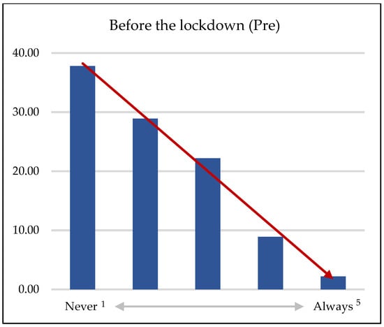 The Wilcoxon rank test showed a statistically significant increase in the frequency of Flipped Classroom sessions (z = −4.80; p < 0.001) during social distancing. Secondly, the frequency table was observed to analyse its distribution (Table 2). The difference in frequencies between before and during the lockdown was also calculated (Table 2). The results were presented in a graph, in particular a bar chart, to facilitate comparison of the data before (Figure 1) and during lockdown (Figure 2).