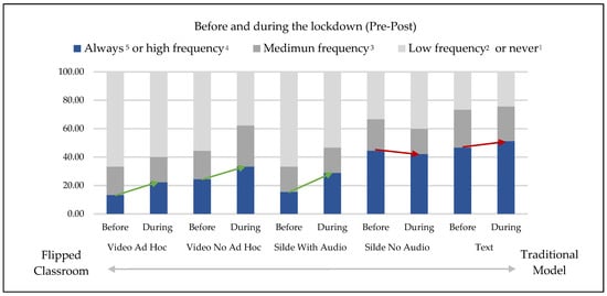The Wilcoxon rank test showed the statistically significant increase in the frequency of non-ad hoc video (z = −2.860, p = 0.004) and slide presentations with audio (z = −2.049, p = 0.040) during social distancing. However, the results indicated the absence of statistically significant differences for ad hoc video (z = −1.402; p = 0.161), slide presentations without audio (z = −0.745; p = 0.456) and text (z = −0.300; p = 0.764). The frequency table before social distancing (Table A1) and during social distancing (Table A2) were also observed (Appendix B) to analyse the frequency distribution. The difference in frequencies between before and during the lockdown (Table A3) was also calculated (Appendix B). The results were presented in a graph, in particular a bar chart, to facilitate comparison of the data before and during lockdown (Figure 3).