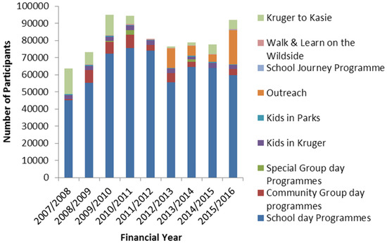 Kruger National Park was also involved in projects that foster health and a clean environment by investing in environmental education and waste management programmes to schools and neighbouring communities. Through the five environmental interpretation centres, KNP has several interpretation centres. It has both curriculum and non-funded curriculum projects aimed at ensuring environmental sustainability. The non-curriculum projects are aimed at promoting land rehabilitation, clean-up campaigns and community greening projects. Figure 3 shows the number of participants of various KNP environmental programmes. Through the environmental education programmes, SANParks can bring to the fore issues and challenges facing host communities using part of the money from the Tourism Levy, which is charged to each tourist as they enter SANParks across the country. These projects’ critical issues include climate change, pollution, human-wildlife conflict, poaching and other critical environmental problems.