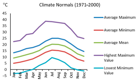 The studied sites are located in the village of Arouca (latitude = 40.92, longitude = −8.26, altitude = 270 m), which is part of the Porto Metropolitan Area and located in the north of mainland Portugal. According to the Koppen classification, the region possesses a Mediterranean Csb climate, with rainy winters and dry and mildly warm summers. Figure 2 shows the normal climate values for air temperature for the Porto Metropolitan Area, and Figure 3 presents the Wind Rose of Arouca.