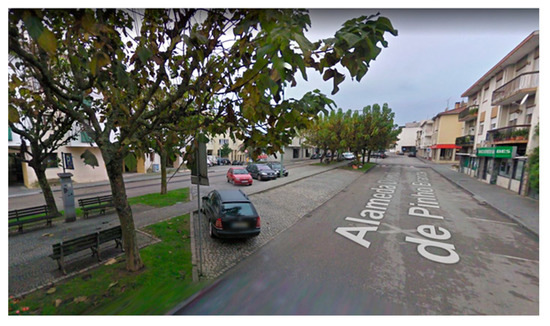 Site 1 (3625 m2 of area) is D. Domingos de Pinho Brandão Avenue, which will be referred to as “Alameda” (Figure 5). It is characterized by its high affluence, due to the diversity of shops and services, and constitutes a place of transition to other places of higher attractiveness. It has a west-east canyon configuration. It sports pedestrian sidewalks built of cement mortar and an asphalt paved road along its entire length, a central area for car parking paved with granite cubes, as well as small green leisure areas that include urban furniture (benches) and some medium-sized deciduous trees. The buildings along both sides of Alameda have a ground floor plus two stories (total height of approximately 9.0 m). Façades are mainly rendered and painted. The percentage of glazing is 55% on average. The ratio H/W (height of the buildings/width between façades) is 0.36.