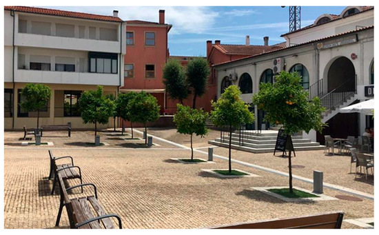 Site 3 (circa 1800 m2 of area) is Brandão de Vasconcelos Square, the central square of the village (Figure 7), where the main events and shows of the municipality take place. Adjacent to the convent, this square includes several cafés and terraces. It is also characterized as a place for both pedestrian and car traffic, and considered one of the main tourist spots and living spaces of Arouca. This square is paved mainly with granite. The buildings around the square have an average height of 9 m, their façades are mostly rendered and painted, and the percentage of glazed area is 55% on average. The H/W ratio varies from 0.18 to 0.23. There are two large trees on each side of the widest part of the square and three others of much smaller size.