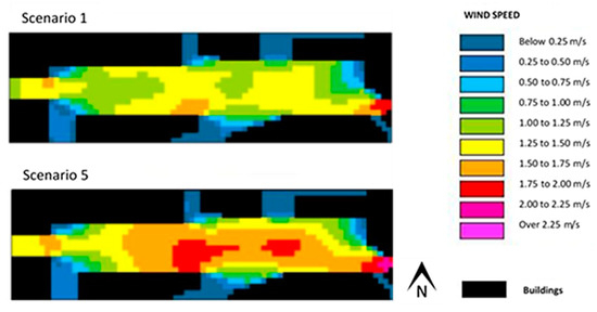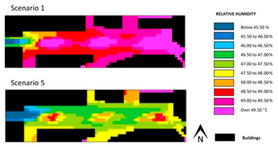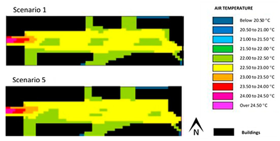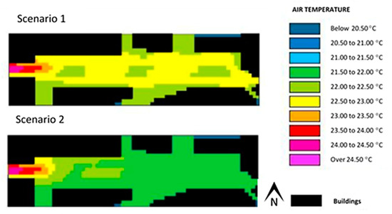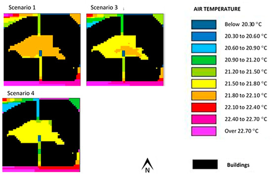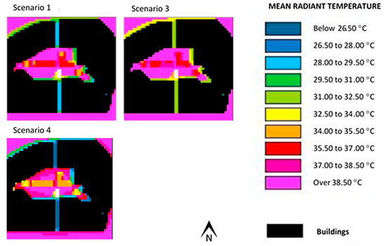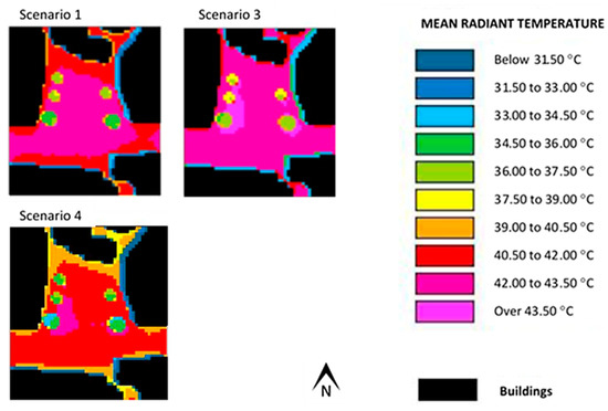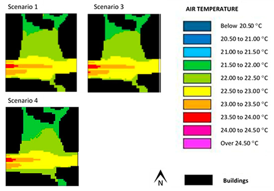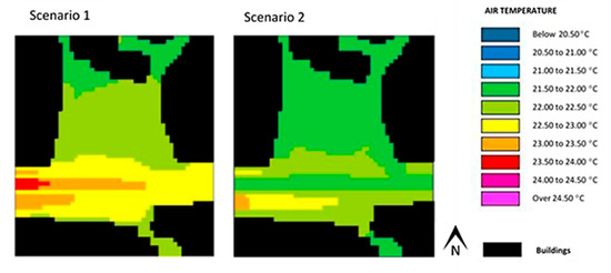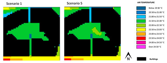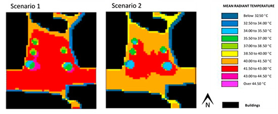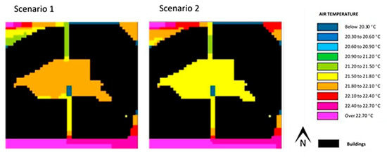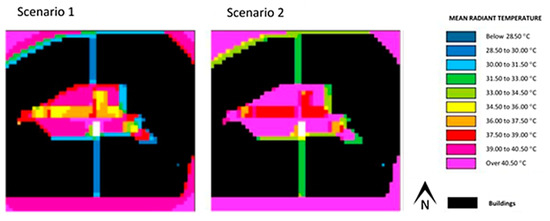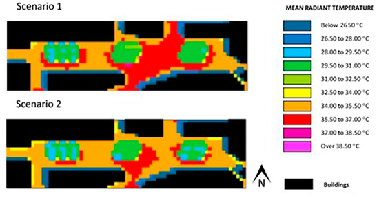 Figure 9 and Figure 10 show the results (scenarios 1 and 2) pertaining to air temperature and mean radiant temperature for the Alameda site, obtained with the use of ENVI-met. In scenario 2, as shown in Table 1, the albedo of the pavement was the same as scenario 1, although its emissivity was higher.