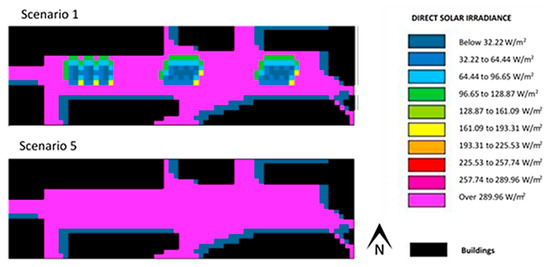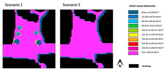 Combining these characteristics, a number of scenarios was determined. Table 1 presents the main assumptions for each of these scenarios. Scenario 1 corresponds to the current situation, in other words, the characteristics of the study areas exactly as they are. The values of the physical properties used for the pavement and for the façades were extended to the total area of these elements, i.e., a weighted average was estimated in function of the heterogeneity of each surface and applied to the whole pavement and to all the façades. The remaining scenarios were simulated, with Table 1 showing the changes imposed on the current situation—this means that changes from scenario 2 to scenario 5 were not cumulative. In scenario 2, an increase in pavement emissivity, or pavement albedo, was tested. In scenarios 3 and 4, the surface properties of the surrounding façades were altered to high albedo and transparency, respectively. Scenario 4 was tested as an extreme theoretical situation, in which solar radiation is transmitted almost totally to the inside of the buildings, something which is obviously not recommended if indoor thermal comfort is to be retained. Finally, in scenario 5, the physical properties of surfaces were kept as they currently are and the removal of vegetation was simulated instead.