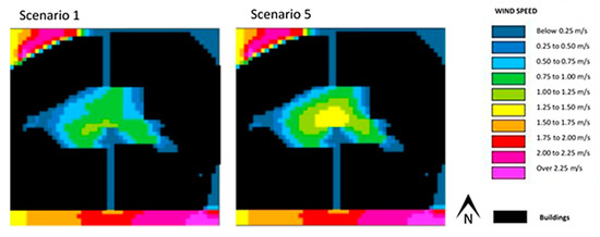 Thus, the results presented all correspond to noon of 23 June 2017, characterizing a summer day at a time when the sun is high and solar irradiance is intense. Since the west wind is the most prevalent in the area, this was the wind direction considered in the simulations. The software used provides hourly results. In this way, the behavior of the variables under analysis throughout the day could better be understood, as it was possible to directly connect the results to the solar trajectory.