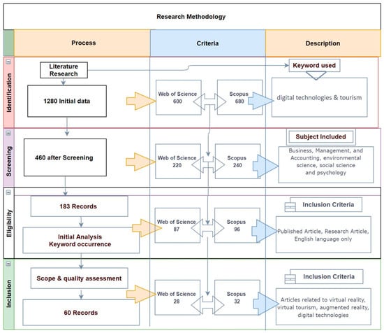 This article reviews the technologies used in the tourism and hospitality industry from the year 2016 to 2020. This review’s aim was the digital future of tourism development after the COVID-19 pandemic situation—the leading development in the tourism industry in recent times due to the digital technologies in literature. Research on the use of digital technologies in tourism is now established as an academic field, and the number and quality of publications are increasing rapidly. This trend is also noticeable in the global healthcare concerns after the COVID-19 pandemic, where the technology market is expected to expand. In the present study, the total numbers of full articles were 60 retrieved from the two databases, ‘Web of Science’ and Scopus, and thoroughly reviewed in PRISMA statement 2009. Besides, irrelevant and duplications are removed for better theoretical development for the current research. The final 60 articles are further classified into four major categories based on methodology, segment, settings, theories, and dimensions. The primary classification of literature is related to virtual reality and tourism, in that the literature mainly discusses the importance of virtual reality in the development of the tourism industry with the collaboration of virtual reality. Virtual reality significantly contributed to many other industries as a developing tool. Figure 7 is showing the literature outcome.