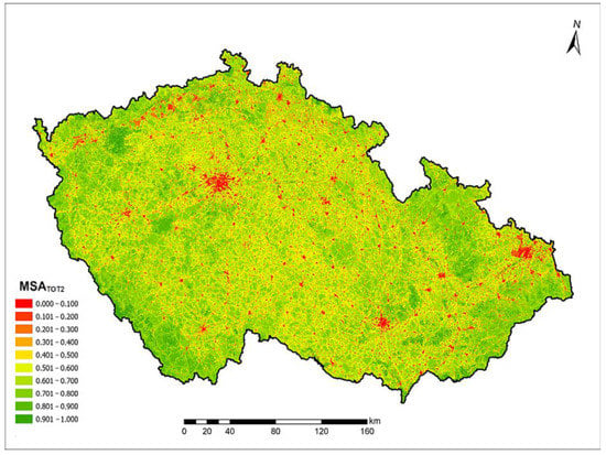 Only 16% of the MSATOT2 values were found in the interval from 0 to 0.4 for the whole CR. This occurred because the indicators MSAI, MSAF, and MSAN ranged only from 8 to 32% in the MSA interval 0–0.4. This result was caused by the lower vulnerability of large-scale areas of distant natural and unnatural habitats to infrastructure development and fragmentation (Table 5 and Table 7).