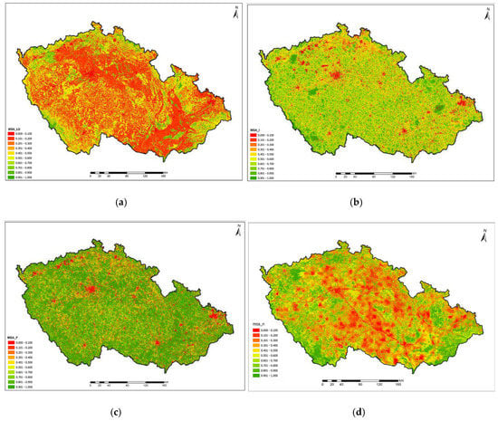 The highest values of all MSA indicators were found in the mountainous border zones and in the hilly parts in the military areas of the CR. These high values of MSA indicators mostly corresponded with the occurrence of large, protected areas. The lowest values of indicators were found in the vicinity of large cities and in arable land areas (Figure 1 and Figure 2).