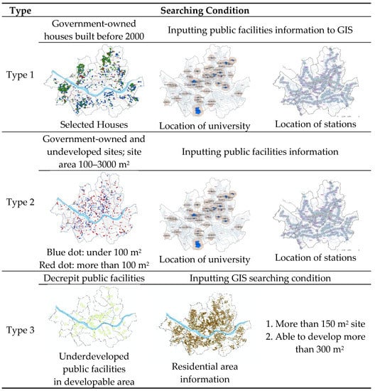 In this step, the sites are identified based on the features listed in Table 1. The Seoul government operates a GIS containing information about government-owned sites, public facilities, and public housing purchased from private sectors. The research objective is to estimate the applicable sites for the development of the long-term plan of the Seoul government and thus, the scope of the search was limited to government-owned buildings or sites. To determine applicable sites for each business model, the features listed in Table 1 and additional conditions relevant to each model were used as search conditions. Table 2 lists the search conditions for each model. To search the sites considering the conditions, QGIS, which is an open-source program, was used, and the GIS information was downloaded from the government-operated GIS portal, the National Spatial Data Infrastructure Portal of Korea.