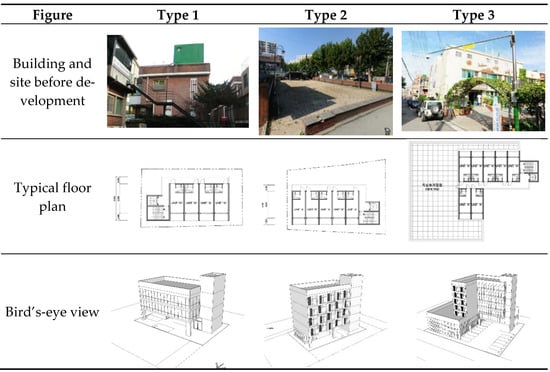 To explain the feasibility analysis of SSPM, three sites were selected for each business model. As shown in Table 2, these sites have higher development priority and potential than other sites because of their greater developable area. To conduct feasibility analyses, the number of residential units and long-term cash flows including rental fees, construction costs, government subsidies, and maintenance costs must be known. Therefore, the architectural planning for each site was developed in consideration of the site conditions. Table 4 lists details of the planning, and Figure 4 shows the building before development and the developed architectural planning (e.g., floor plan and bird’s-eye view).