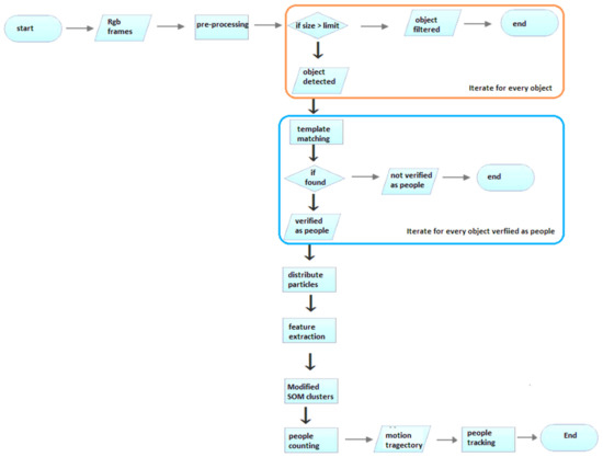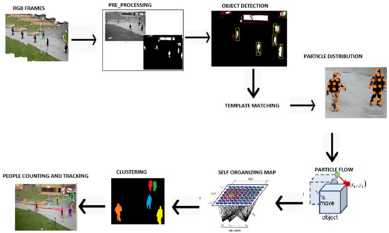 The proposed method consists of seven main steps: preprocessing, object detection, people verification, PF and feature extraction, SOM-based clustering, people counting, and people tracking. The main architecture of the proposed system is presented in Figure 1.