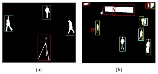 Object detection in a preprocessed image. (a) Blue boxes represent detected objects and (b) red boxes represent filtered objects.