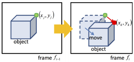 For people tracking, the motion trajectories [69] of people are extracted by matching frame metrics and maintaining an accurate count. We maintained a record of the idle-state for each person. The idle state represents a person located in the previous frame but not located in the current frame. The f-value represents the number of frames in which a person remains in an idle state. If a person remains idle for 10 frames, then that person will be removed from the count. A record table for each person is maintained, including the person’s id, position in the previous frame pt-1, position in current frame Pc, idle state i-value, and the number of frames with the idle state as the f-value, as shown in Table 1. If there is a person whose previous state is null but who exists in the current frame, then the count for the current frame is incremented. People tracking is performed using motion trajectories across sequences of frames. We calculate the initial velocity, final velocity, initial point, final point, horizontal distance [70], time duration, and direction for each frame based on the previous frames. These values are then used to predict the future positions of people as shown in Figure 12.