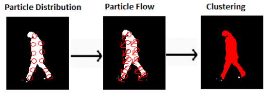 where x is considered as movement of object horizontally and should be greater than zero. If some people are occluded by other objects, then there is a chance of collision between PFs. To solve this problem, a specific zone of neighboring pixels is defined, and each particle outside that zone is considered as an independent flow particle. The PF [61] evaluation process is presented in Figure 8.