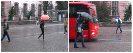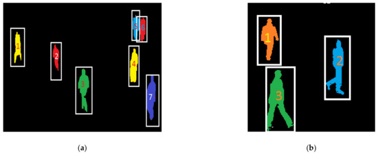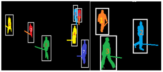 The proposed system performed very well on both datasets for low- and medium-density crowds. There were some limitations in the case of high-density crowds and continuously occluded objects. We were not able to detect human silhouettes that were partially or fully occluded by other objects for extended periods of time, which is the main reason for the low accuracy of people detection methods. In the images displayed in Figure 15, we could observe people who were partially and fully occluded, but if they remained occluded for a long period of time, their positions could not be detected throughout a video.