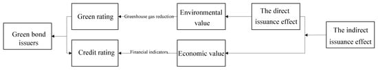 With the development of green finance, companies and projects tend to be rated as green enterprises and projects to acquire financing cost advantages. In 2019, the issuance scale of Chinese green corporate bonds was the world’s largest source of issuance. However, it has been shown that the issuance effects of green corporate bonds may not be consistent with their bond ratings. For green corporate bonds, the issuance effects consist of the direct effect and the indirect effect. The direct issuance effect is an environmental value, such as greenhouse gas reduction of green bond issuers. The indirect effect, including the environmental values and the economic values, is the external effect of one issued green corporate bond to promote more issued green corporate bonds in one region. The relationship between the direct effect, the indirect effect and ratings is shown in Figure 3.