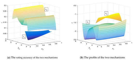 Furthermore, we consider the impact of direct issuance effect and indirect issuance effect on rating accuracy and profits when the rating accuracy does not reach equilibrium in Figure 5. When introducing the indirect issuance effect, there are big differences in regulatory effect between the dual rating mechanism and the integrated rating mechanism. In this situation, the rating accuracy in the dual rating mechanism is much higher than the rating accuracy in the integrated rating mechanism . Meanwhile, the profit in the dual rating mechanism is much higher than the profit in the integrated rating mechanism . The results indicate that the dual rating mechanism has a better regulatory effect when the rating accuracy does not reach equilibrium, and the direct issuance effect and the indirect issuance effect are both considered in the interval presented by Proposition 1.