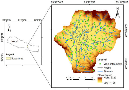 Location of study area showing major settlements, roads, streams, and elevation.