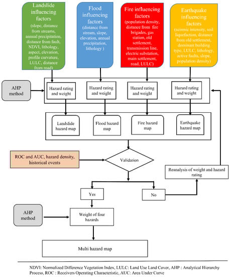 The following are available online at https://www.mdpi.com/article/10.3390/su13105369/s1, Table S1: The selected factors involved in the landslide hazard assessment, their classes and their ratings, Table S2: The selected factors involved in the flood hazard assessment, their classes, and their ratings, Table S3: The selected factors involved in the fire hazard assessment, their classes, and their ratings, Table S4: The selected factors involved in the earthquake hazard assessment, their classes and their ratings, Table S5: Scale of preference between two parameters in analytical hierarchy process (AHP) [], Table S6: Random Consistency Index (RI) [,], Table S7: Pair-wise comparisons, weighting coefficients of each adopted factor in landslide hazard evaluation, and the estimated CR value, Table S8: Pair-wise comparisons, weighting coefficients of each adopted factor in flood hazard evaluation, and the estimated CR value, Table S9: Pair-wise comparisons, weighting coefficients of each adopted factor in fire hazard evaluation, and the estimated CR value, Table S10: Pair-wise comparisons, weighting coefficients of each adopted factor in earthquake hazard evaluation, and the estimated CR value, Table S11: Pair-wise comparisons, weighting coefficients of each adopted factor in multi-hazard evaluation, and the estimated CR value.