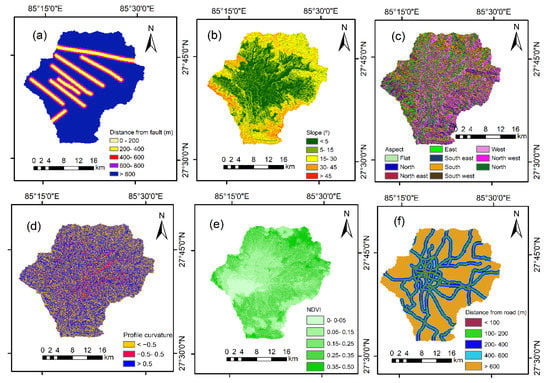 Thematic maps of the factors used in the landslide hazard assessment: (a) Distance from fault; (b) Slope; (c) Aspect; (d) Profile curvature; (e) NDVI and (f) Distance from road.