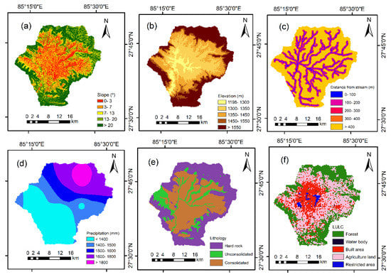 Thematic maps of the factors used in the flood hazard assessment: (a) Slope; (b) Elevation; (c) distance from streams; (d) Precipitation; (e) Lithology and (f) LULC.