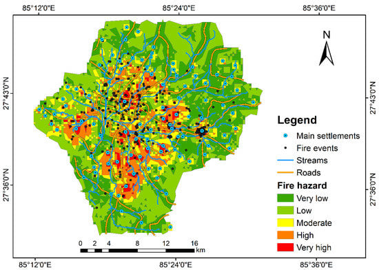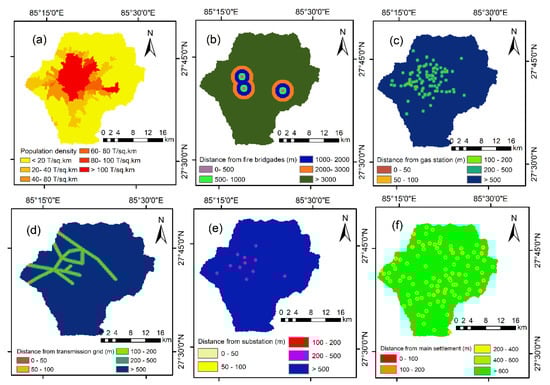 Fire and explosion in electric substations occur due to various reasons such as (i) lightning strike, which can damage wires, equipment, and leads excessive electricity to flow into the transformer, (ii) heavy rain and strong winds result in trees to strike on the transformer, (iii) sudden damage to transformers which can also lead to overcharging, which produces excessive quantity of heat and sparks to ignite the mineral oil, and (iv) formation of flammable mixtures in different electrical equipment []. Hence, settlements close to electric substations are always at a risk of fire. In this study, distance from electric substations was categorized into five classes as presented in Figure 5e.