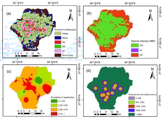 Thematic maps of the factors used in the earthquake hazard assessment: (a) Dominant building type; (b) Seismic intensity; (c) Probability of liquefaction and (d) Distance from old settlement. MMI in figure stands for Modified Mercalli Intensity.