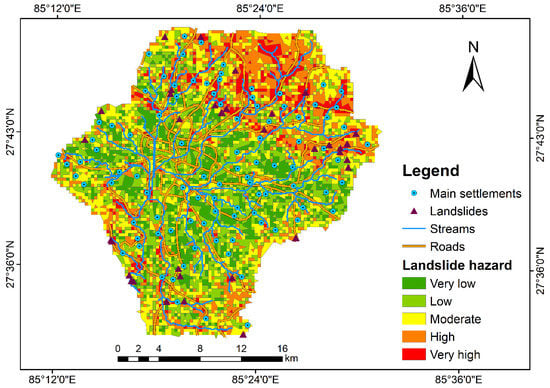 After applying the AHP, the landslide hazard map was prepared as shown in Figure 7. The landslide hazard zonation map was produced by classifying the scores between 1 and 5 using the Jenks Natural Break classification feature provided in Arc-GIS 10.6. The valley was categorized into five classes, corresponding to different hazard levels as shown in Figure 7, which highlights that 28.53% (highest) of the land area is moderately susceptible to landslide and 8.78% (lowest) of the land area demonstrates very high susceptibility to landslide (see Table 3). The spatial distribution of landslide hazard highlights that the north-eastern part of Kathmandu Valley has high to very high susceptibility while the central area of Kathmandu Valley is less prone (very low and low susceptibility) to landslide hazard. Lower vulnerability of landslide in a highly populated area of Kathmandu Valley is attributed to relatively flat terrain (slope = 0–5°), comparably lower elevation and annual precipitation, and flat profile curvature (−0.5–0.5). Normally, low frequency of landslide takes place at very high and very low elevation because slope generally consists of rocks with high shear strength at very high altitudes, and more gentle slope at very low altitudes, while intermediate altitude slope leads to instability that is more susceptible to a landslide []. The north-eastern part of Kathmandu Valley is highly and very highly prone to landslide due to the presence of the mild to steep slope and also due to proximity of active fault lines.