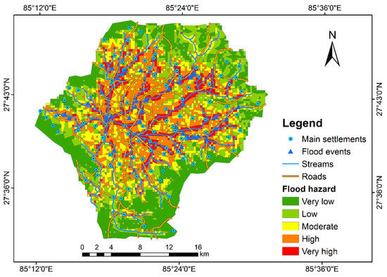 A hydrological model can be used to evaluate flood peaks, depths, and volumes, and to generate flood hazard mapping. However, calibrating these models requires intensive data based on meteorological, hydrological, and geomorphological information. Many developing countries including Nepal lack such data at the watershed scale. Thus, a GIS-based flood hazard analysis was employed to assess the flood hazard in Kathmandu Valley. Table S8 shows selected factors, their classes, and their ratings for flood hazard assessment. For each factor class, a hazard rating of 0 to 4 was allocated. The 0 value denotes a more stable condition whereas 4 indicates high potential of flood hazard. A 6 × 6 matrix was prepared for the pair-wise comparison of different factors where the highest priority was given to slope, and the lowest priority was assigned to the LULC. The weights of 0.249 and 0.064 were calculated for slope and LULC respectively, and the CR value 0.044 (see Table S8) lies within the permissible limit of <0.10 as recommended by Saaty []. The flood hazard index was calculated using a weighted linear combination as depicted in Equation (3).