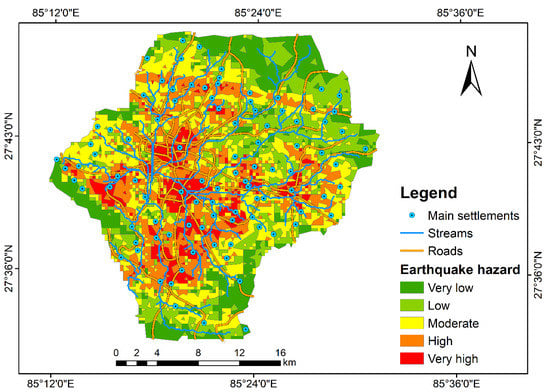 To perform seismic hazard assessment, we used influencing factors such as seismic intensity, soil liquefaction, distance from old settlement, dominant building type, LULC, lithology, active faults, slope, and population density. The rating of factor classes considered for earthquake hazard assessment is shown in Table S4. A 9 × 9 matrix was built for the pair-wise comparison of influencing factors. The CR value was calculated as 0.021 that lies in permissible limit of <0.10. The seismic intensity (wt. = 0.178) and distance from old settlements (wt. = 0.178) were assigned as very important factors followed by soil liquefaction (wt. = 0.161), dominant building type (wt. = 0.161), active faults (wt. = 0.096), slope (wt. = 0.075), LULC (wt. = 0.064), population density (wt. = 0.044), and lithology (wt. = 0.043) as outlined in Table S10. The fire hazard assessment map was prepared by the sum of the weighted linear combination as depicted in Equation (3).