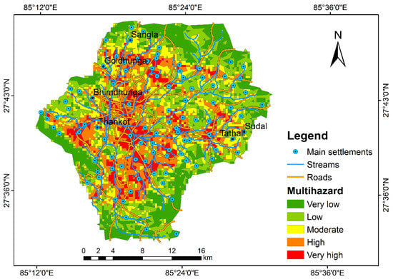 Spatio-temporal distribution of primary impacts of a natural hazard is commonly presented in terms of hazard maps. Hazard mapping for different types of natural hazards such as floods [,,,,], earthquakes [,,], landslides [,,,], and urban fire [,] is widely reported in the literature. Hazard maps for different natural processes usually differ in definition/detail of hazard, spatio-temporal scales of the processes, and handling/integration of epistemic and aleatory uncertainties. Such maps are challenging to incorporate in policymaking, preparedness initiatives, and resource allocation efforts. In reality, natural hazards are complex processes and have cascading, triggering, knock-on, and domino effects. Risk mitigation and planning for such complex processes requires a holistic treatment of different hazards and their interactions, i.e., multi-hazard risk assessment. Therefore, a multi-hazard assessment is an effective tool in disaster and risk reduction, which depicts the coverage of potentially hazardous areas considering overall hazard scenarios. This term was first presented internationally in the context of sustainable development and Agenda 21 aiming to reduce environmental and disaster risk []. The United Nations (UN) supports the importance of multi-hazard risk assessment and elaborates it as “an essential element of a safer world in the twenty-first century”. Furthermore, it determines the vulnerable areas for multiple hazards with their threat levels that contribute to reduce the human casualties, economic losses, and identify priority areas for sustainable management []. Multi-hazard risk assessment faces several barriers such as lack of standard definitions of hazards caused by different processes, quantification of vulnerability and risk levels, methods for integrating different hazards, and the lack of empirical data, among others.
