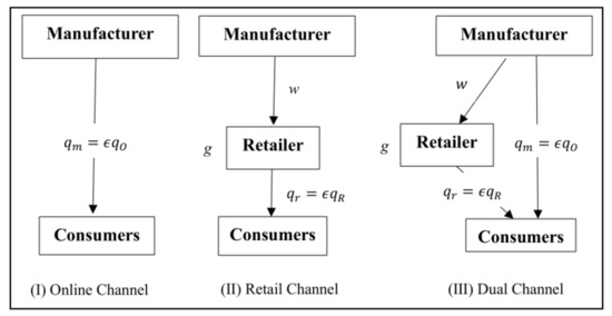 Motivated by the above analysis, this paper focuses on a dual-channel green supply chain consisting of one competitive manufacturer and one retailer. The manufacturer produces one green product, and the retailer purchases the environmentally friendly product and sells it to consumers in the retail market. The manufacturer can also develop its own online channel to sell the green product, such as Midea. The supplier is unreliable, i.e., has a random yield. The retailer invests in green marketing to promote the green product. Our model addresses the issues of the dual supply chain’s input quantities of the green product and the level of the green-marketing effort considering an unreliable supplier. We assume the supply chain has information symmetry, and all the supply chain players are risk-neutral. Based on the motivations discussed in the above introduction, we analyze the following three available channel strategies: a single online channel, a single retail channel, and a dual-channel, as illustrated in Figure 1.