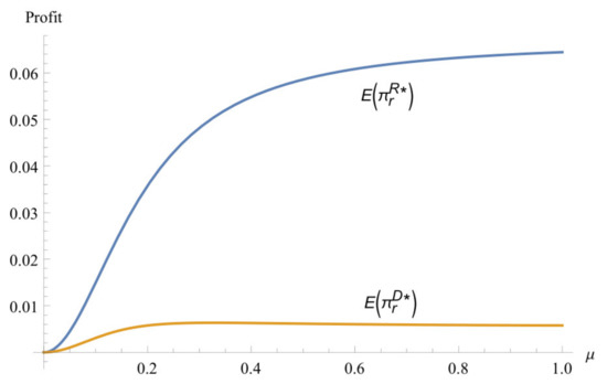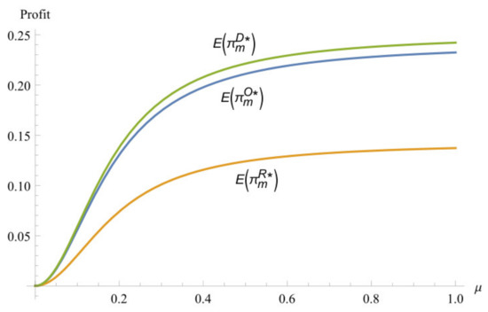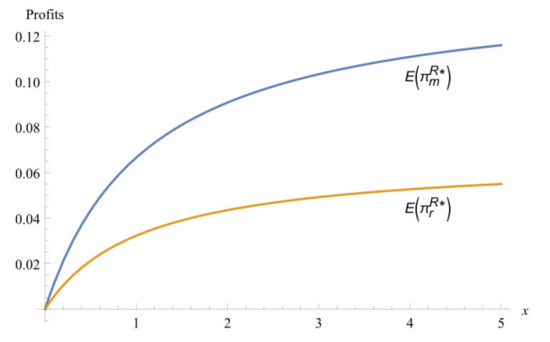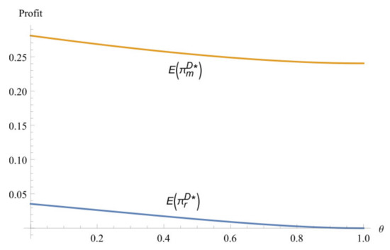 The findings toward the profits of the unreliable supplier and the retailer are in line with our expectation: the higher the technology level of the unreliable supplier, the less the loss generated by the yield uncertainty. The two-echelon green supply chain always benefits from the improvement of the unreliable supplier’s technology level. In this case, the manufacturer and the retailer are in a cooperative relationship rather than a competitive one, so they can share the benefits of an improved technology level. The results are illustrated in Figure 2.